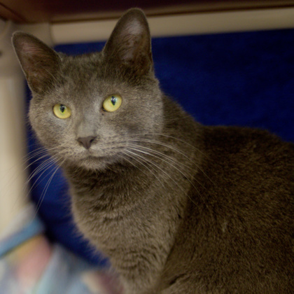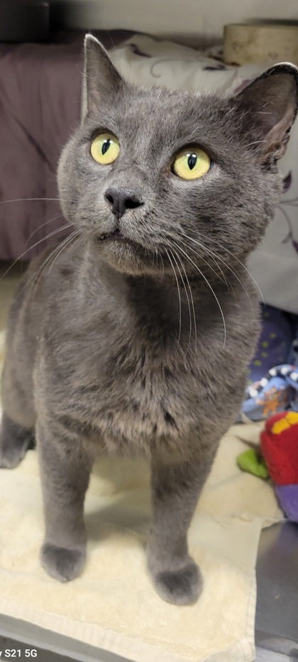 Meet Donald, the velvet-pawed lovebug! With a coat the color of a rainy-day sky and eyes that reflect the seafoam green of the ocean waves! Donald is a handsome and devoted companion and after a long day, there's nothing he loves more than to curl up beside you on the couch for some head scratches and a nap. His purr is like a gentle motor, and he has a soft little chirpy meow to greet his favorite people.