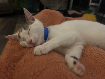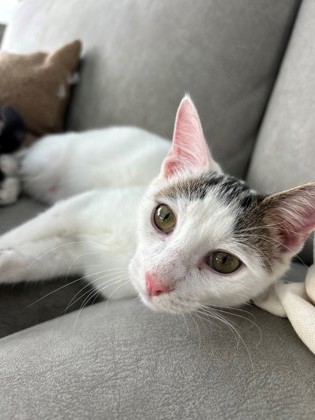 Domino is a curious, playful guy with lots of energy. When he's tired, he willfully climbs into your lap to cuddle for a little nap until he's ready to explore again. Kittens often do best in pairs, so please consider adopting Domino with a sibling or another, playful, cat-friendly cat for company.